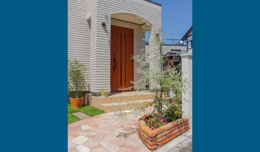 アプローチはローズ色の石貼りで装飾。お客様がDIYで仕上げた、玄関アプローチ横の花壇は素敵にデコレーションされています。この一角が、お客様のセンスと努力が詰まった、まさに“自分だけのエントランス”となっています。