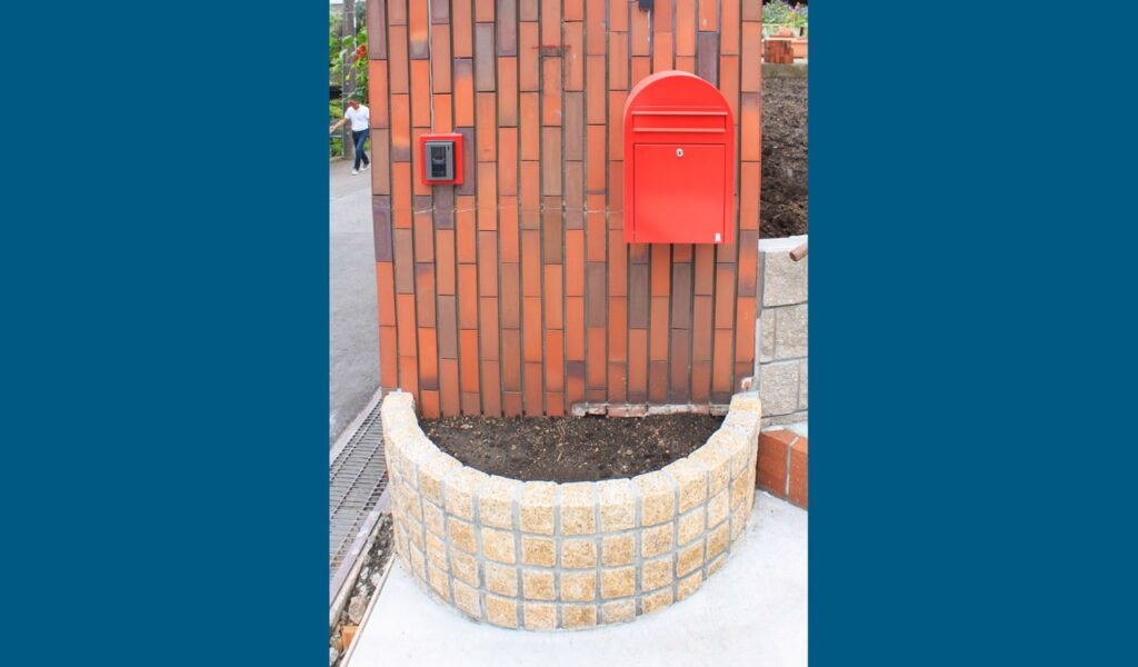 そして施工後は、お庭の3分の1を使い、植栽目地と階段のアールが織り成す美しい駐車スペースへと変貌しました。傾斜のある前面道路からも入りやすいよう施工しています。既存の門屏の前には新たにピンコロ花壇を設け、明るい色調の外構がお家の周りを包みました。レンガの縁取りは綺麗なアールになり、洗練された印象を与えています。以前に比べて、ご自宅全体が明るく華やかな印象になりました。