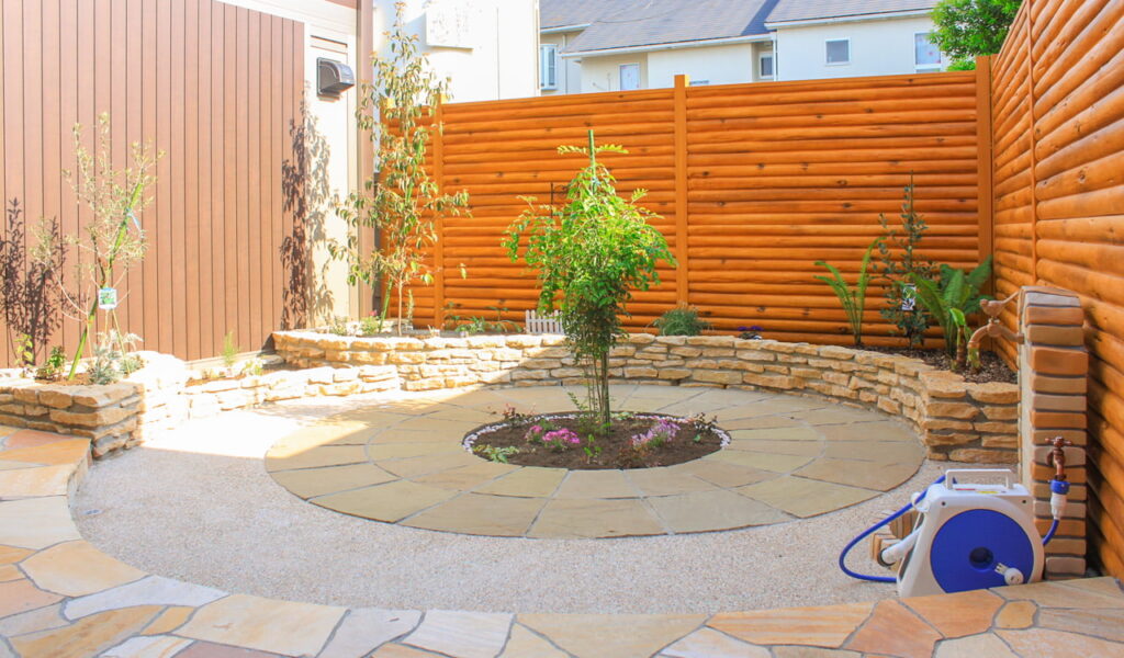 お客様のご希望を叶えるべく、私たちはサークルテラスとリクシルのスタイルコートを用いたお庭デザインを提案しました。色彩の統一感を重視し、お庭にはコッツウォルズストーンの花壇に囲まれた砂岩のサークルテラスを配置。自然の風合いを重視したエクステリアは、お庭をより美しく、そして落ち着きのある空間に仕上げました。