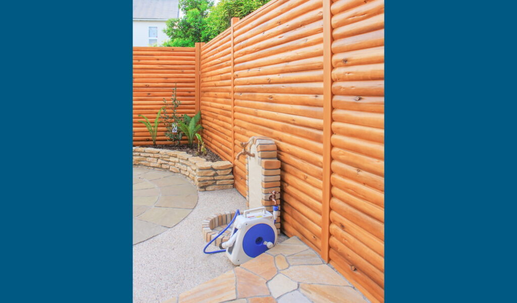 次に、お客様が特に気にされていた隣家からの目隠し。1.8mの高さがある、タカショー ログ調フェンスで覆われた、しっかりとしたプライベートテラスが確保できました。木の風合いが空間にぬくもりを与えつつ、プライバシーを確保。さらに、エスビックの立水栓を設置し、機能性とデザイン性を両立させました。