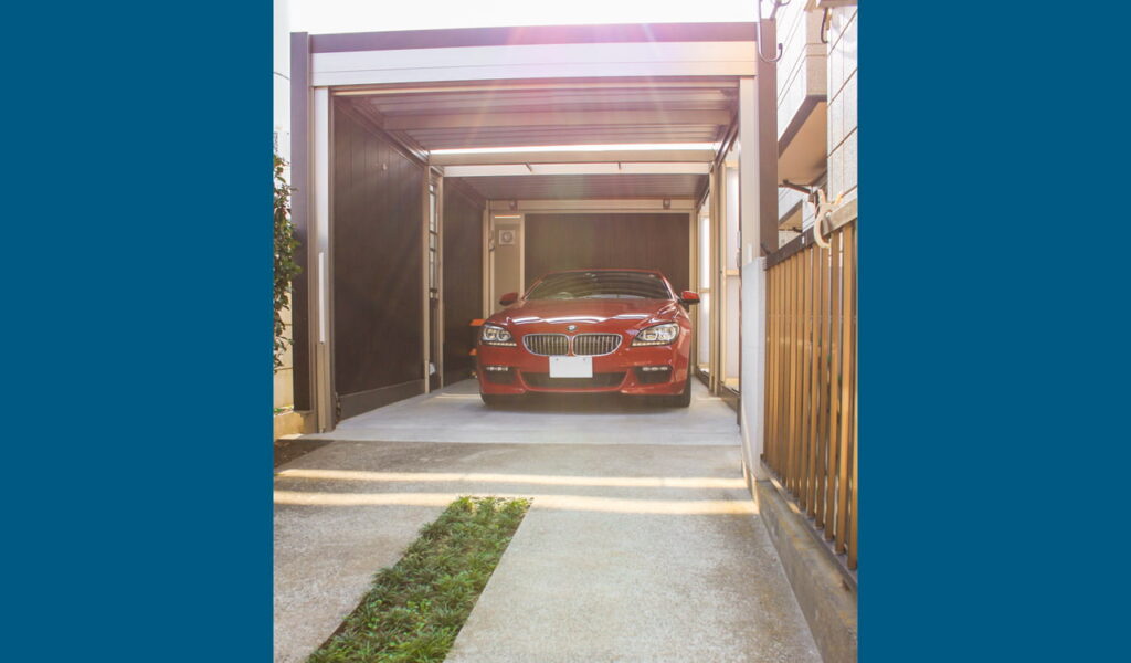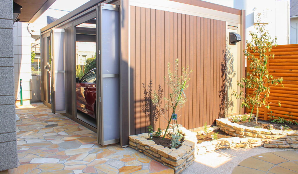 そして、お客様が特にこだわりを持っていた車の保護。スタイルコートを設けたことで、車が汚れることなく安心して駐車できる空間を提供しました。お庭から見たスタイルコートは、周囲の景色と一体感を持つよう計算された設計となっています。