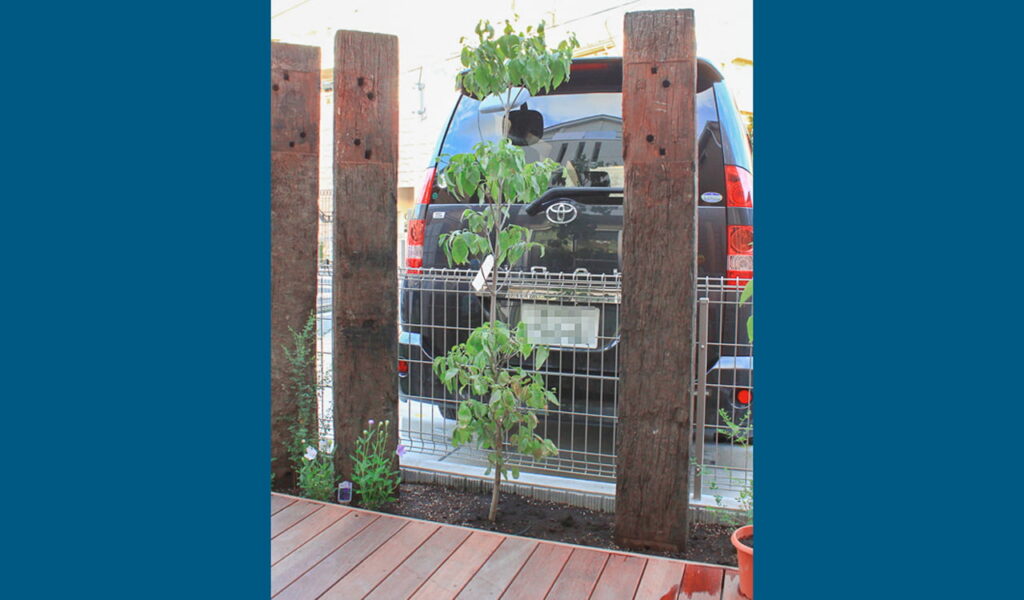 その後、リビングから外を見ることができないように、枕木フェンスを設置しました。その間隔には、既存のハナミズキを移植。このハナミズキは春には美しい花を咲かせ、秋には紅葉が楽しめる四季折々の風情を感じさせてくれます。