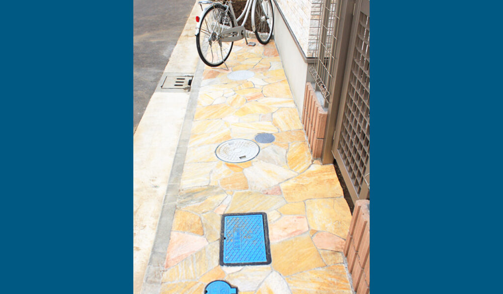 お客様の邸宅は、自然石の乱貼りが印象的な駐車場と、未来への期待を膨らませる花壇スペース、そして機能美を追求したウリンの列柱が特徴的な外構でまとめられています。駐輪スペースは、自然石の乱貼りを採用し、視覚的にも分かりやすく、また趣も感じさせるデザインになっています。