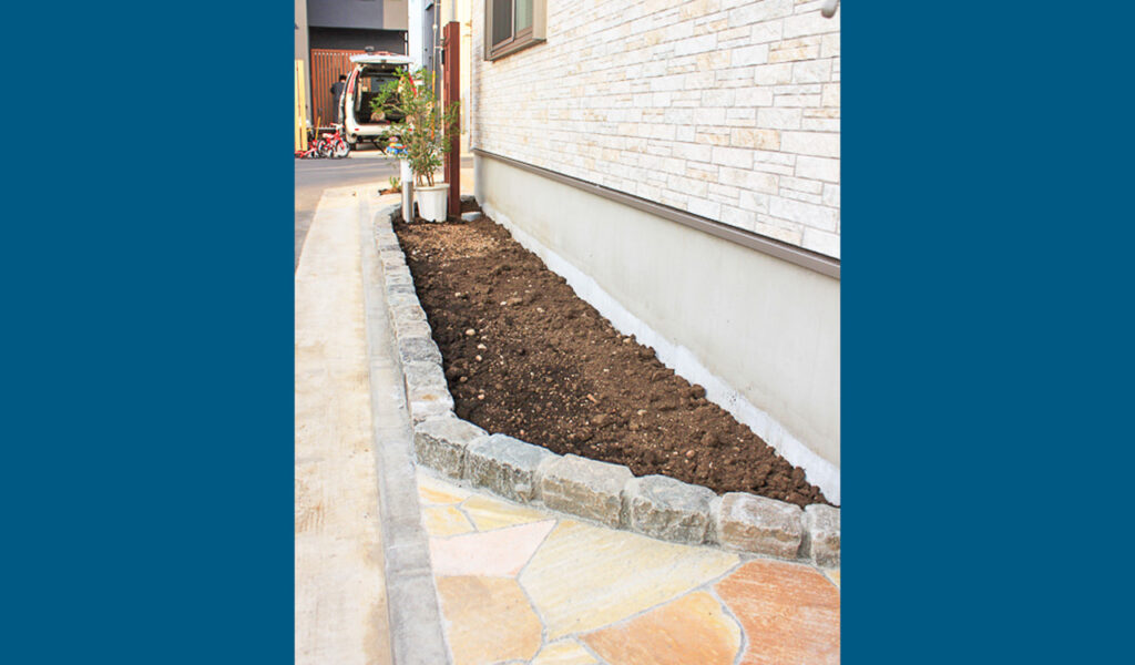 お客様が特に楽しみにしているのが、花壇スペースです。植栽はまだ入れず、これからどのような花や緑を育てようかと、お客様自身の想像力を刺激する空間となっています。