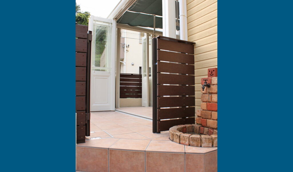 老朽化したウッドデッキとパーゴラのリフォーム、そして笠石のレンガが壊れた塀の延長。そんなお客様のご要望に我々は応えるべく、全体的にエクステリアをプランニングしました。特に、お客様が悩まれていたのが、プライベート空間の確保と、ペットのワンちゃんが外に逃げ出さないようにする工夫でした。