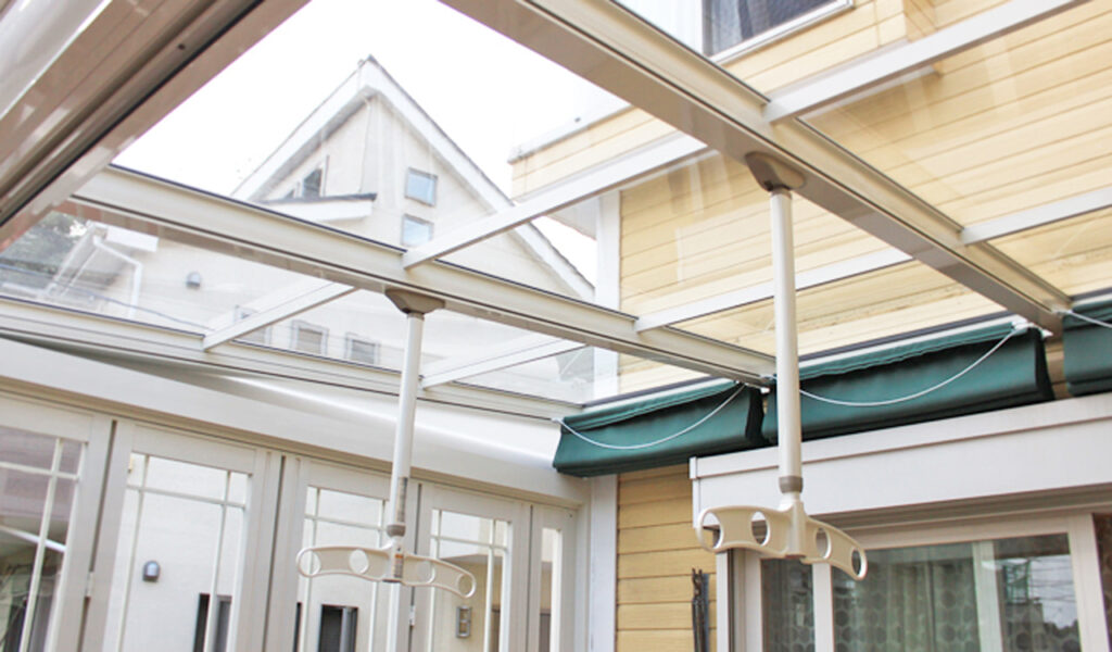 そして、ガーデンルーム内には、パネルが全面開放できるようにすることで、夏でも涼しく過ごせる空間を作りました。また、天井のシェードで日差しを防ぎ、吊り下げ式の物干し竿かけも設けました。通路のスペースには、お客様の好みに合わせて贅沢にタイルを使用しました。