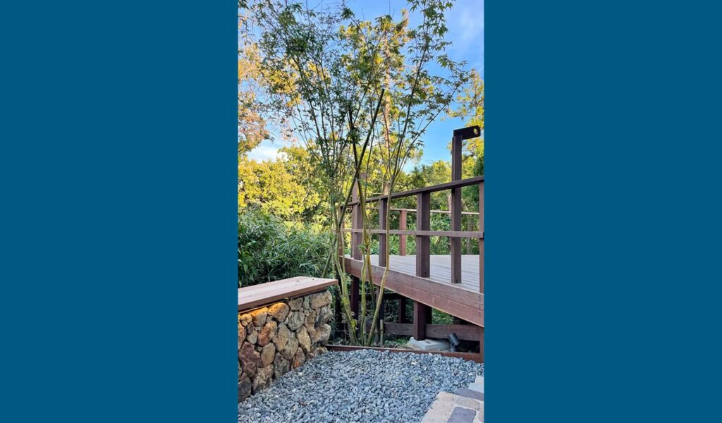 敷地内の大木の整理や傾斜によって大変だった部分は多々ありますが、デッキの突き出しの角度や長さを調整しながら、ご要望にだった木々の中に浮かぶようなウッドデッキが完成しました。日中は鳥のさえずりに耳を傾け、夜は月を眺める。自宅に居ながらにして、旅先に来たような感覚を楽しんでいただけています。