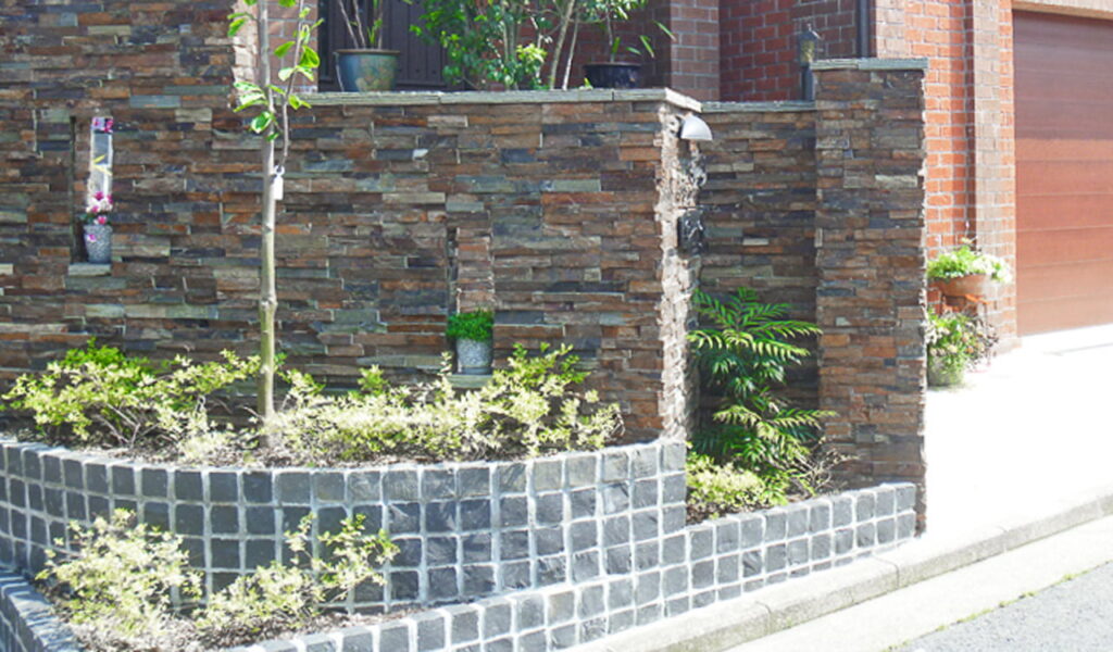 レンガ造りの家の雰囲気にあわせ自然石を張り付けた門塀でデザインしたファサード。お庭は大きなサークルテラスとウッドデッキで来客が多くてもみんなでバーベキューを楽しめる十分な広さで施工しました。和風のお庭が好きな施主様の要望に応えるために坪庭やバルコニーなどに和テイストの眺めるお庭を取り入れました。
