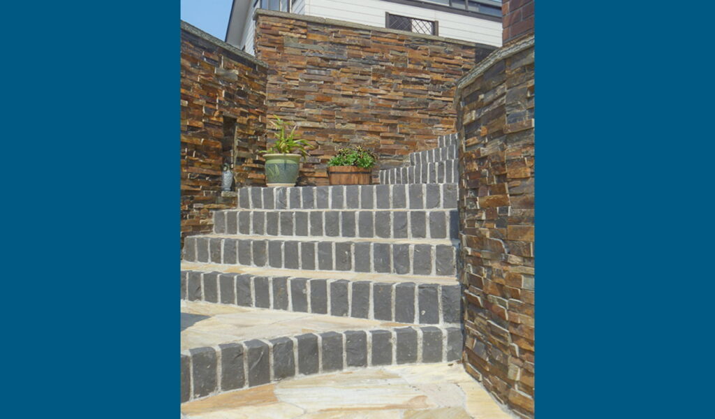 まず、お客様が最初に目にする玄関周りは、濃紺のピンコロ石を使った白い目地の花壇を設けました。その階段はジェラストーンの乱形石貼りで、あたかも自然が作り出したかのような美しさを追求しました。