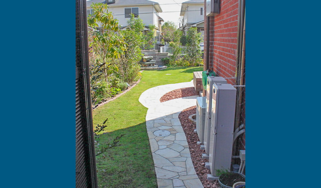 そして、玄関からお庭へと進むと、バックヤードには和風の坪庭を設置。日陰となっており、涼をとるのに最適な空間となっています。さらに、バックヤードを過ぎるとメインガーデンへと続きます。