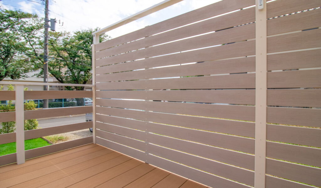 ここで一つ、お客様とのエピソードを。お客様が一番悩まれていたのは、フェンスの色合いと素材感でした。そこで我々は、ウッドデッキと同じく樹脂製の人工木でブラウン調の目隠しフェンスを提案。これにより、統一感のある外観を実現しました。落下防止柵は、風や光を遮らないようデザインし、自然の風と光を存分に感じられる空間を創り出しました。