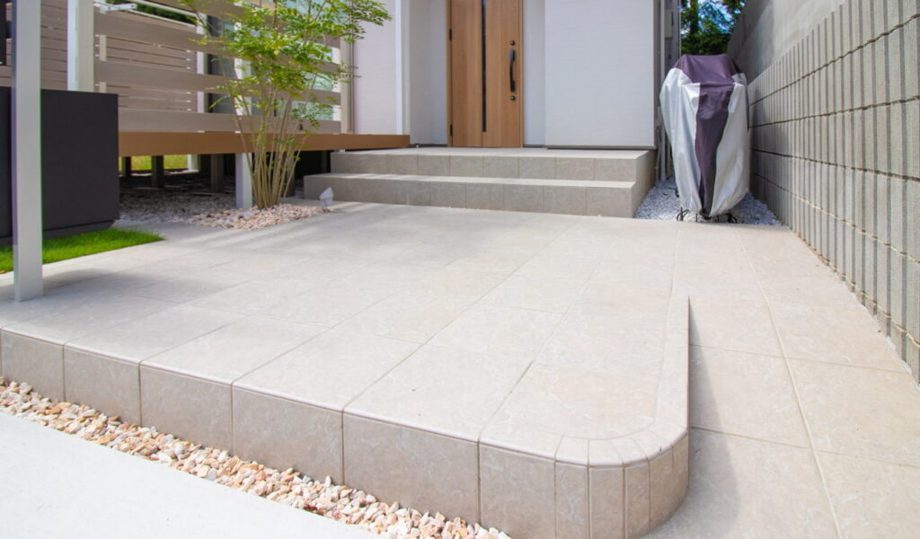 また、お客様が自転車をよく利用されるとのことで、アプローチには自転車が通りやすいようにスロープを設けました。お客様のライフスタイルを考慮したこの提案に、お客様からは大変喜んでいただけました。外構部分にスペースが広く残っていた為、車庫土間やアプローチさらに広めのウッドデッキ・芝庭とゆとりのある新築外構が完成しました。プールや外遊びにたくさん使ってください!
