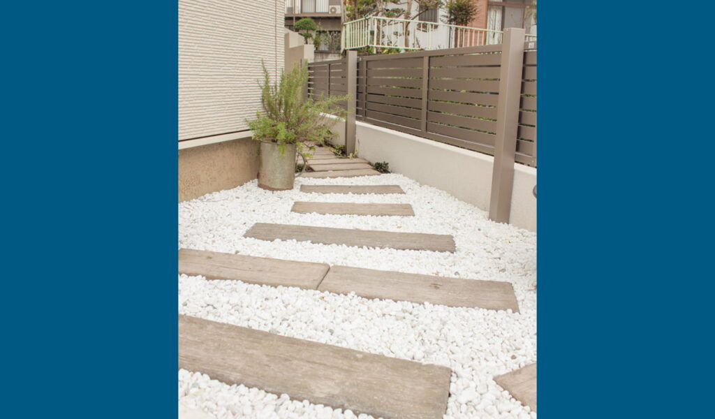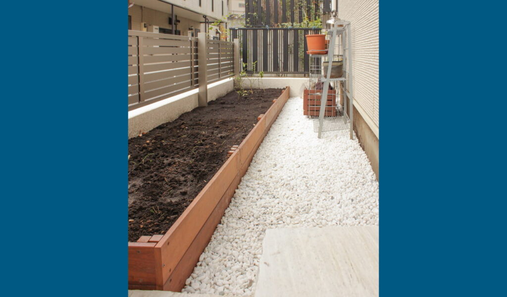 淡いコントラストが素敵な、擬似枕木と白玉砂利から続いていくアプローチは、両側に植栽を植え、ここでもガーデニングを楽しんでいただけます。お子様と楽しめる高さのユニット式ウリン製花壇もあり、細部にまでお客様のご要望を反映させたお庭が完成しました。