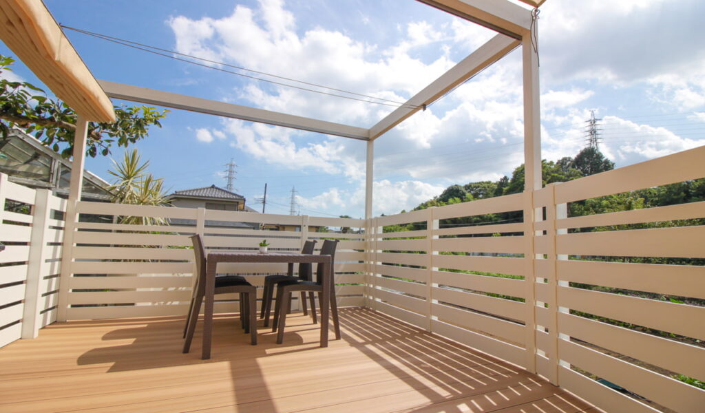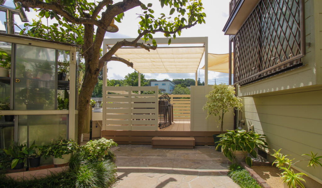 お客様が来客との時間を楽しめるための、シェード付きのパーゴラとウッドデッキのベストな組み合わせ。明るいお庭をご希望のため、フェンスは白のアルファウッドフェンスを採用。眺望の良いひらけた立地のため、間隔は広めに取っています。ゆったりとお茶ができる、素敵なテラスが完成しました。