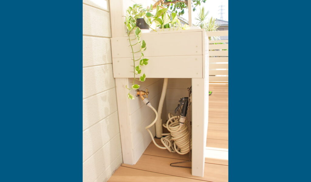 フェンスと同じアルファウッドで装飾したガーデンシンクは、機能性とデザイン性を兼ね備えた作りとなっています。また、シンクの下には水やりやデッキ掃除用に二つ目の蛇口を造作し、日々のメンテナンスも楽に行えます。