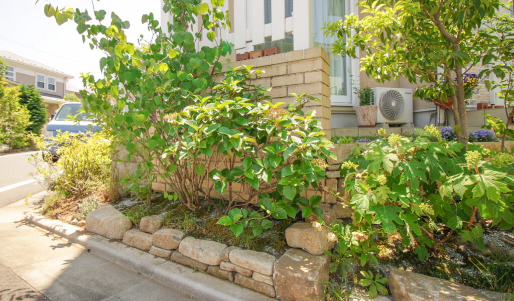 雑木林風の植栽をご希望いただき、植栽の選定をしていきました。ハート型の葉が可愛らしいマルバノキと、白い花が咲くハクサンボク。これらは、四季折々の表情を見せ、庭に豊かな多様性をもたらします。また、アオハダとコマユミを目隠しに配置することで、新鮮な緑のシェードが庭を涼しげに彩ります。これらの植栽は、夏の暑さを和らげ、冬の寒さを防ぐ役割も果たします。美濃石の石積みは、植物たちを美しく引き立てています。