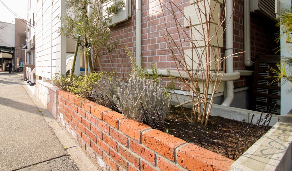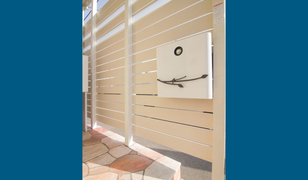 通行量の多い道路からの視線を遮るために、白い目隠しフェンスで玄関前をしっかりカバー。覆うように庇を新設し、雨対策も万全に行いました。フェンスの内側にポストを設置することで、雨に濡れることなく郵便物を取り出すことができ、いたずら対策にもなります。玄関ポーチの横には花壇を設置し、自然な目隠しとなるように植栽をいれました。