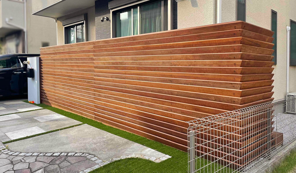 お客様のお宅は、大きな掃き出し窓が特徴の開放感あふれる住宅。しかし、その窓からの視線を気にされていました。そこで我々は、ウリン材の逆ルーバーフェンスを施工。オリジナルの逆ルーバー構造で、目隠しと日当たりを両立する美しいフェンスに仕上げました。ウリンフェンスは経年変化で風味が増していき、その変化を楽しむことが可能です。