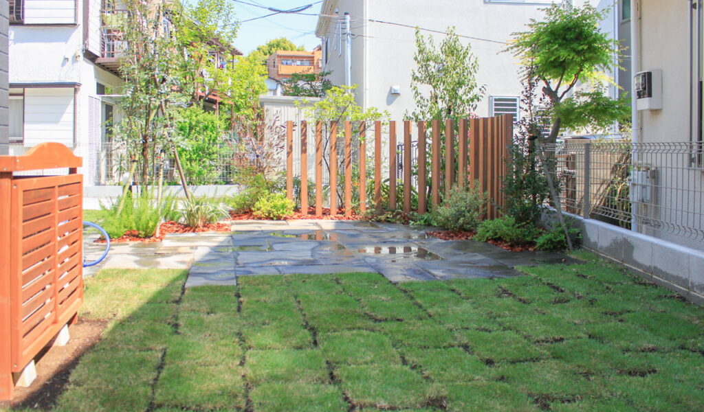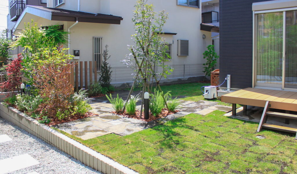 まず我々が提案したのは、芝生をメインに、敷石を組み合わせたシンプルなデザイン。余分な装飾を削ぎ落とし、広さを生かした開放感と、敷石がもたらす高級感を最大限に引き出しました。施工後のお客様のお庭は、まるで美しい絵画のよう。芝と敷石が調和をなし、見る者を心地よく包み込む空間が完成しました。