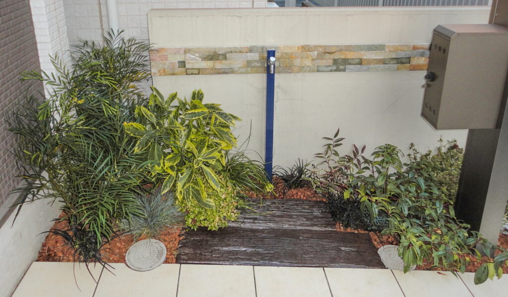 アプローチ側の植栽スペースにも手を加えました。元々お客様がきれいに管理されていらっしゃいましたが、バリエーションを増やし賑やかな雰囲気に。その中に立つのは、シックで大人な雰囲気を持つネイビーの立水栓。パンの代わりに腐らない枕木調のブロックを敷き、耐久性と機能性を兼ね備えた空間を作り上げました。その緑の空間が、都心の中にひっそりと佇むお客様の家に、自然の彩りと落ち着きをもたらしました。
