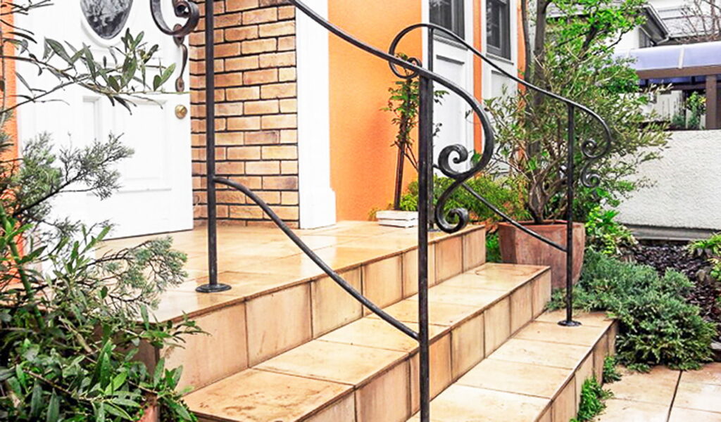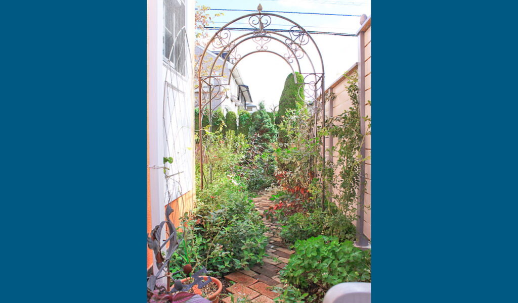 施工後のガーデンは、まさに英国の贅沢な庭園そのもの。アイアンアーチとアンティークレンガのアプローチ、オリジナルで造作したロートアイアンの手摺りが、古き良き時代を感じさせます。そして、適度に日の光が差し込むメインガーデン。ここではお客様の愛犬もデッキの上で気持ちよさそうに過ごしています。