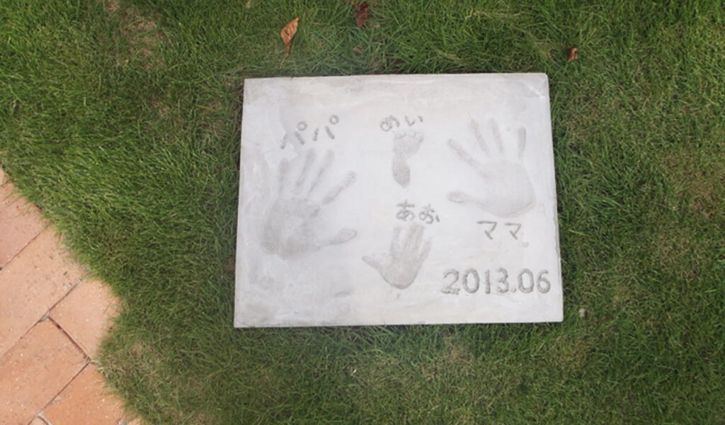 ウッドデッキに合わせたウリンの機能門柱とレンガの色に合わせたポスト、これらは我々のこだわりの一つ。新築完成の喜びをお客様とともに記念手形に残しました。この手形が、お客様の新たな生活のスタートを象徴しています。