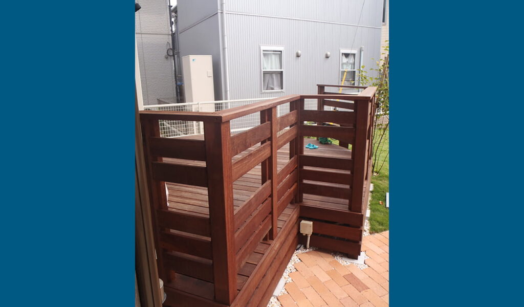 変形のウッドデッキに合わせたフェンスは、お子様が小さいため下の方を重点的に幕板を張っています。立水栓もウッドデッキに合わせウリンで造作。お子様たちが上りやすいように幅広のステップを設置しました。これら全てが、お客様の生活を豊かにするための我々のこだわりです。