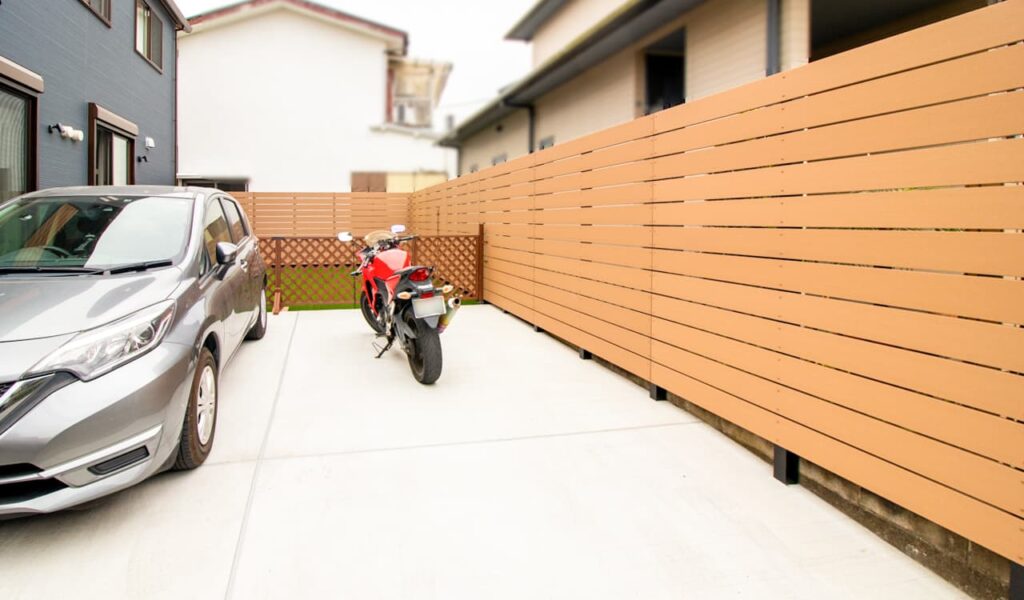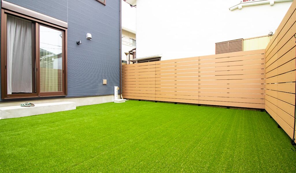 その結果完成した庭は、プールで遊んだり、人工芝の上でくつろぎながら外で食事ができる広々とした空間となりました。また、2台分の駐車場とお庭は、高めの目隠しフェンスを設け、プライベート空間を確保。
