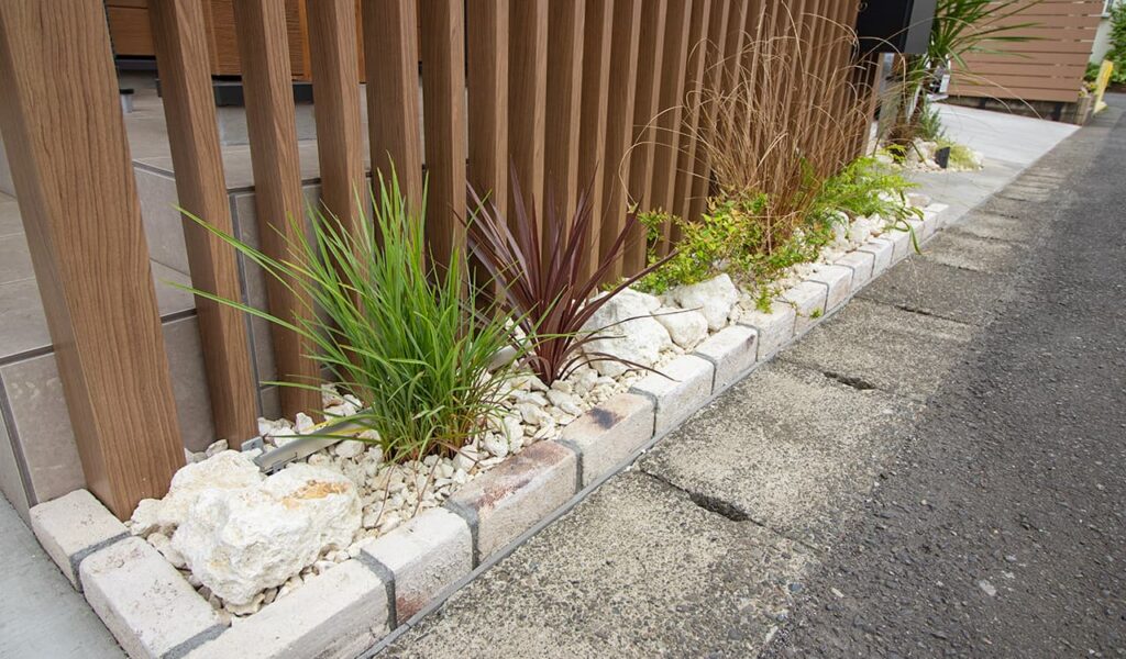 コンクリート製の枕木とアプローチのタイルは色味を合わせ、統一感を出しました。玄関前の目隠しにはインパクトのあるLIXILのプラスGを採用しました。プラスG前の植栽スペースには、長い年月を経た深い味わいがリアルに表現されたオルダブリックを使用しています。建物の和モダンに合わせつつ、お色味に統一感をもたせたプランとなっています。リゾート風や西海岸風もお好みとのことでしたので、琉球石灰岩を使い、さりげなくリゾート風の雰囲気も加えました。