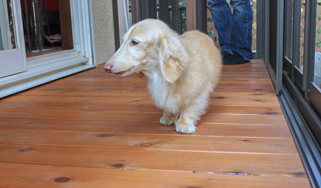コストを下げるためにガーデンルーム内のウッドデッキにレッドシダーを採用しました。風雨にさらされることがないためウリン等のハードウッドである必要がなく、材料の費用を下げることができました。その差額分をガーデンルームのオプション費用に回す提案をさせて頂きました。