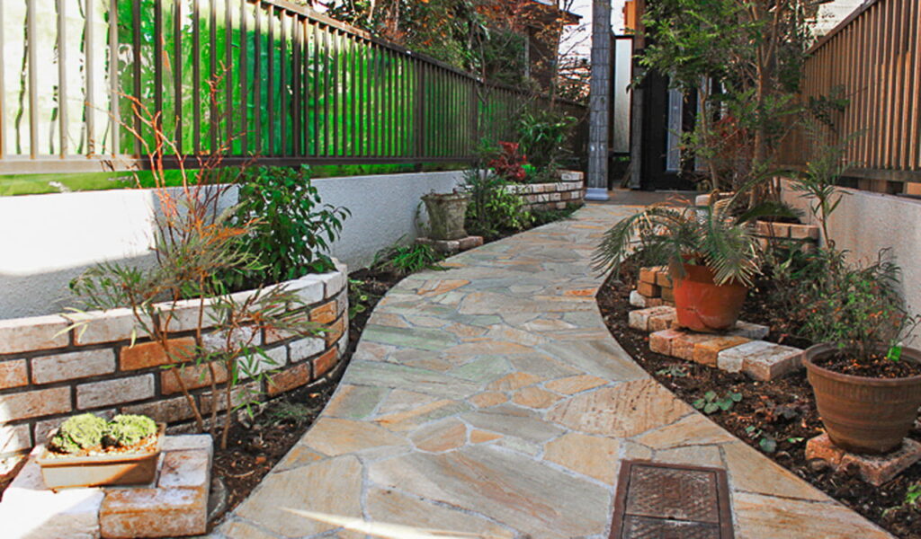 施工後のお庭は、中国砂岩を使った立ち上げ花壇と砂利敷きで、和モダンな雰囲気に一新。自然石の乱貼りとレンガの立ち上げ花壇が、スッキリとした印象を与えつつ、植物との調和を美しく醸し出しました。古くなった竹の庭木戸もウリン材でリフォームし、モダンな黒いポストを設置。一つ一つの変更が、お庭全体の印象を大きく変え、お客様のガーデニングライフをより楽しく、豊かなものに昇華させました。