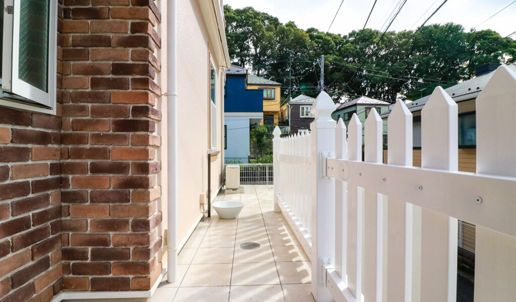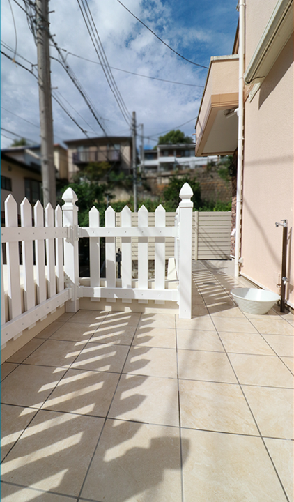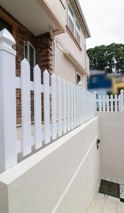 経年で汚れが目立つコンクリートの階段や擁壁を、清潔感あふれる白を基調にリニューアルしました。そして、お客様のご要望に応えるべく、洋風の建物に相性抜群のタカショーのロイヤルフェンスを選択。高級感と爽やかさを両立させ、お客様の住空間に新たな風を吹き込みました。