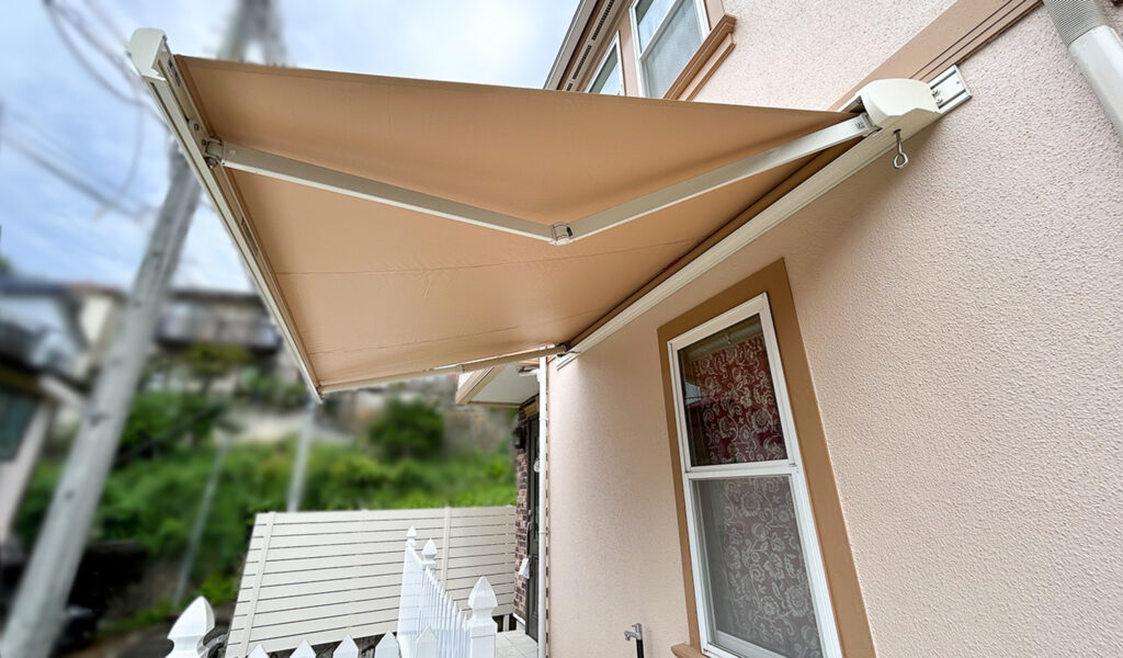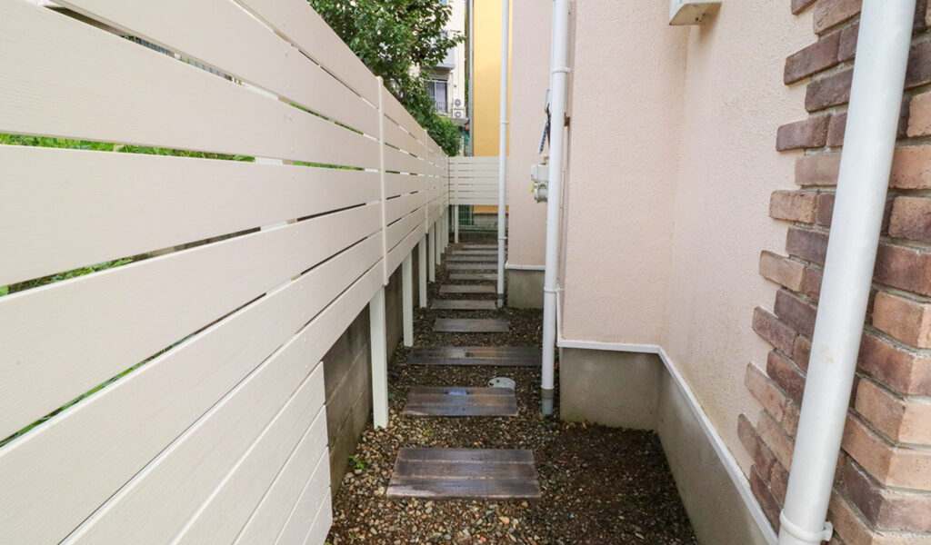 そして、使いづらかった場所を玄関からフラットに続くタイルテラスに変え、立水栓も新設しました。さらに、日差しを遮るオーニングを設置し、夏の暑さを和らげる工夫も忘れませんでした。最後に、建物横の通路は、目隠しフェンスと枕木風の敷石で利便性を向上させ、お客様の生活の質を高めました。
