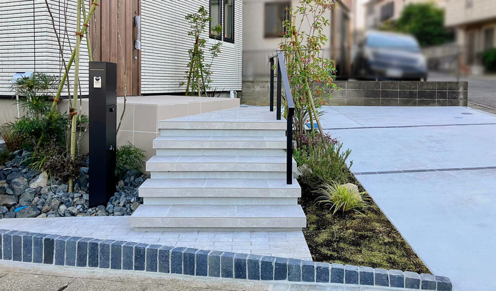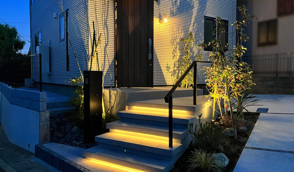 階段の周囲には、程よい目隠しになるよう高木と下草を配植。美しく植物が映えるエクステリアを造り上げました。夜には、階段はライン状の間接照明、植栽もアップライトが灯り、ご家族のご帰宅を迎えます。角地で傾斜のある土地形状でしたので、美しく停めやすい駐車スペースとなるよう、勾配やアプローチの配置を入念に検討しました。
