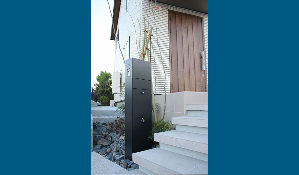 フローティングステップと要所の植栽により、開放的でスタイリッシュな外構を実現。色合いやタイル、石、植栽など、シンプルに厳選した素材だけを使うことで、空間にまとまりを与えることを重視しました。また、フローティングステップと植栽用に設けた間接照明は、敷地の高低差を活かしつつ、お客様の空間に美しい陰影を与え、アプローチを効果的に演出しました。ミニマムなデザインを追求したリクシルの機能門柱FTは、省スペースながら宅配ボックスも兼ね備え、機能性とデザイン性を両立させたものとなりました。