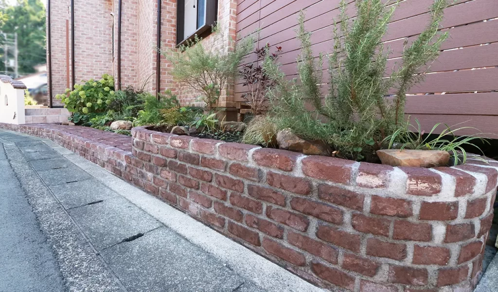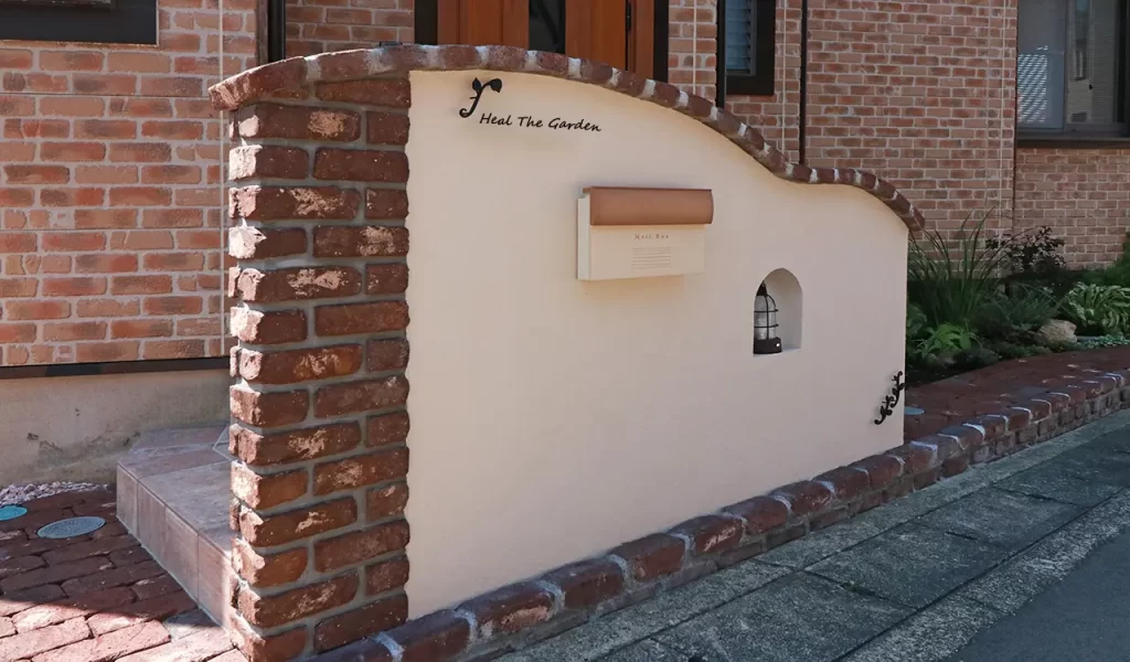 門塀には、お客様の好みであるヨーロッパの田舎風を感じさせる素材を使い、柔らかい曲線を取り入れたデザインをご提案。アプローチと玄関ポーチはレンガ敷きで統一感を出し、既存のポーチタイルは、アンティークな雰囲気のタイルに交換しました。道路に沿ってレンガ敷きのアプローチを作り、花壇のスペースを調整しつつ手入れのしやすい環境を整えました。立水栓にはコンクリート枕木タイプを選び、全体の雰囲気に馴染むよう心がけました。表札、ポスト、マリンランプなどのアイテムも、アンティークな雰囲気が漂うものをセレクトしています。