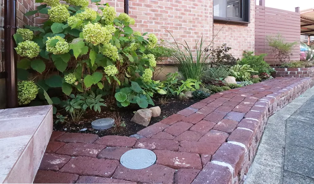 お住まいの場所は横浜市旭区、緑に囲まれた落ち着いた雰囲気が魅力のこの地。お客様から我々にいただいたのは「既存のエクステリアが老朽化してきた、新しい風情を感じる空間にリニューアルしたい」というご相談でした。特にお客様がこだわられたのは、ヨーロッパの田舎のような風情を持つ、枕木やアンティーク雑貨が映えるエクステリア。そこで我々は、お客様の想いを具現化すべく、エイジング加工されたレンガやコンクリート枕木を使用し、新しく生まれ変わったものでありながら、すでに時間を重ねたような風合いを持つ空間を創り出しました。