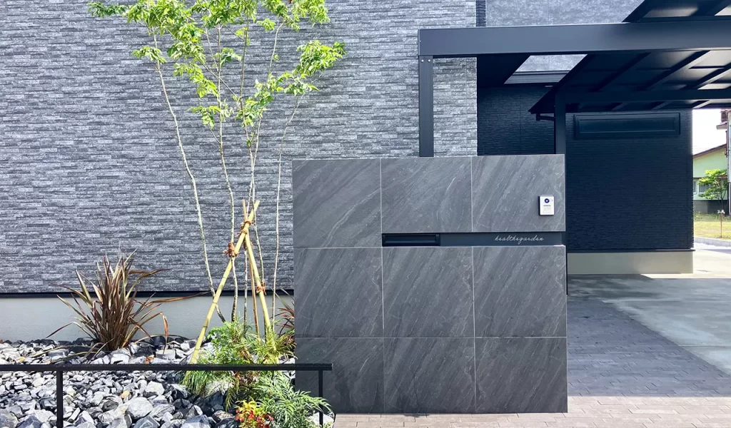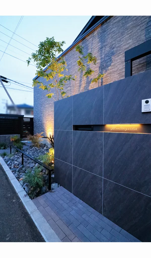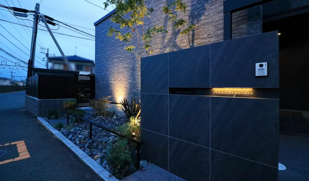 門袖に使用したのは、タカショーのガーデンタイル、モーディカのダークグレー。600角の大判タイルで仕上げ、ミニマルでありながらも存在感と高級感を醸し出しています。割栗石を敷き込んだ植栽スペースや、シンボルツリーのアオダモが建物と外構を自然に繋げるアクセントとなり、美しさを引き立てています。日が落ちると、表札灯と植栽を照らすアップライトが光を放ち、家族の帰宅をあたたかく迎えます。
