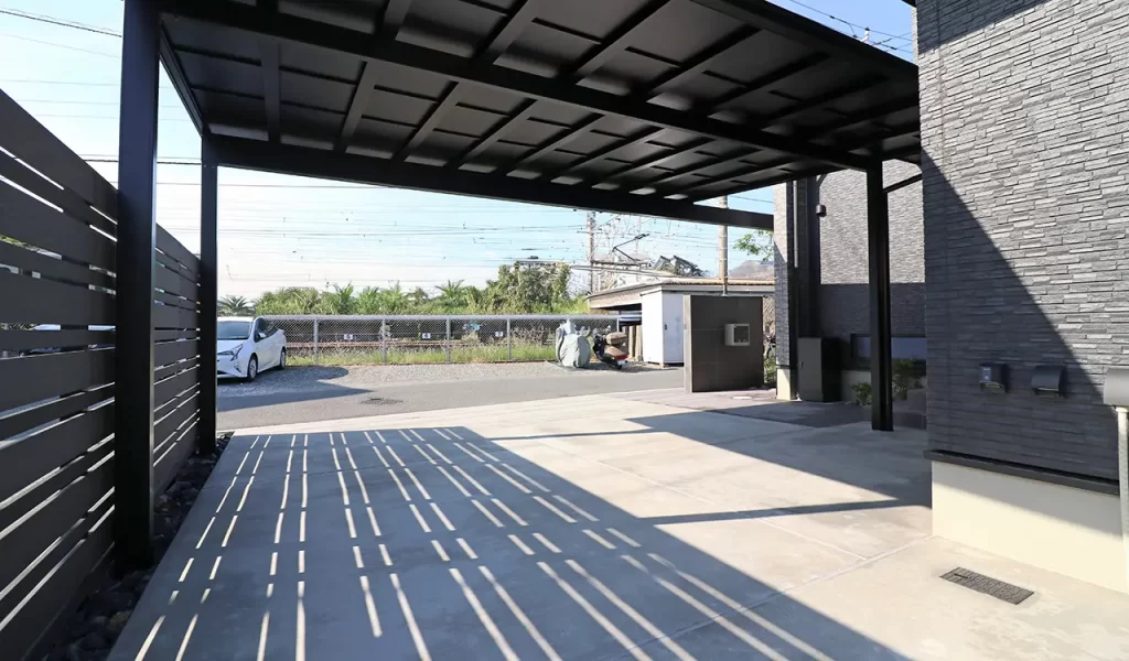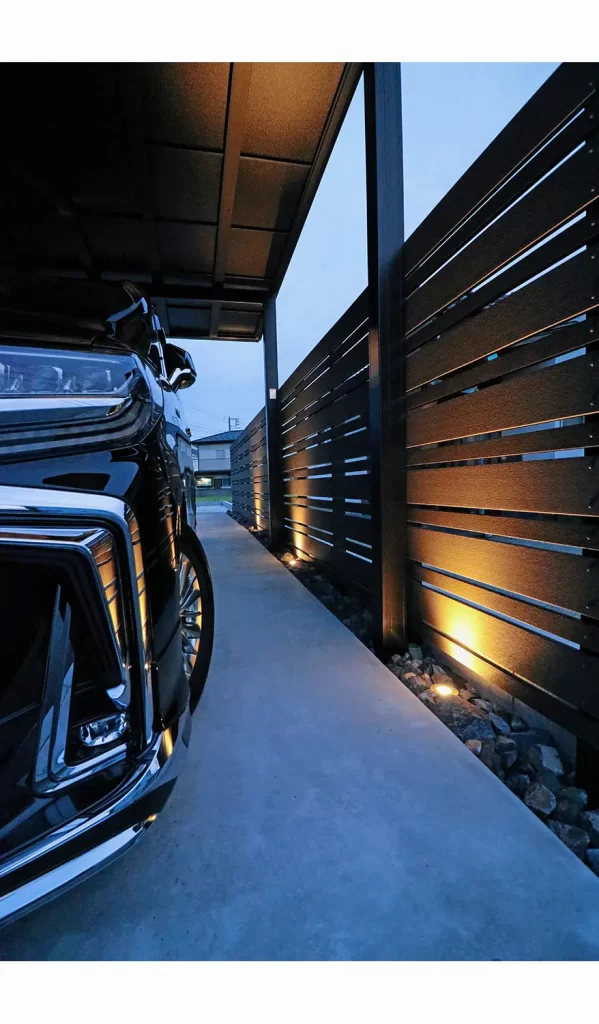 広々としたスペースを確保したカーポートは、リクシル フーゴのブラック。屋根材にはブラックポリカを使用し、落ち着いた格好良さを演出。柱がアプローチの邪魔にならない、梁延長型仕様の商品を採用しています。夜にはフェンス下の照明が目印となり、夜間の駐車も安心です。