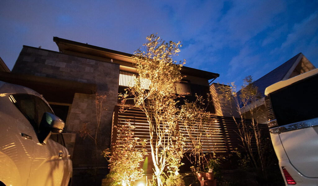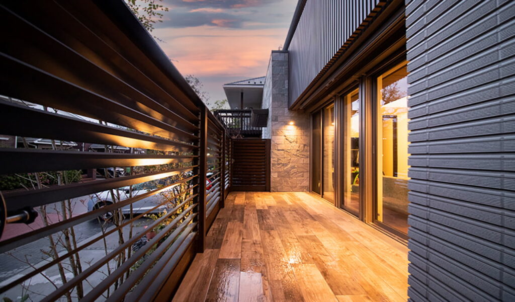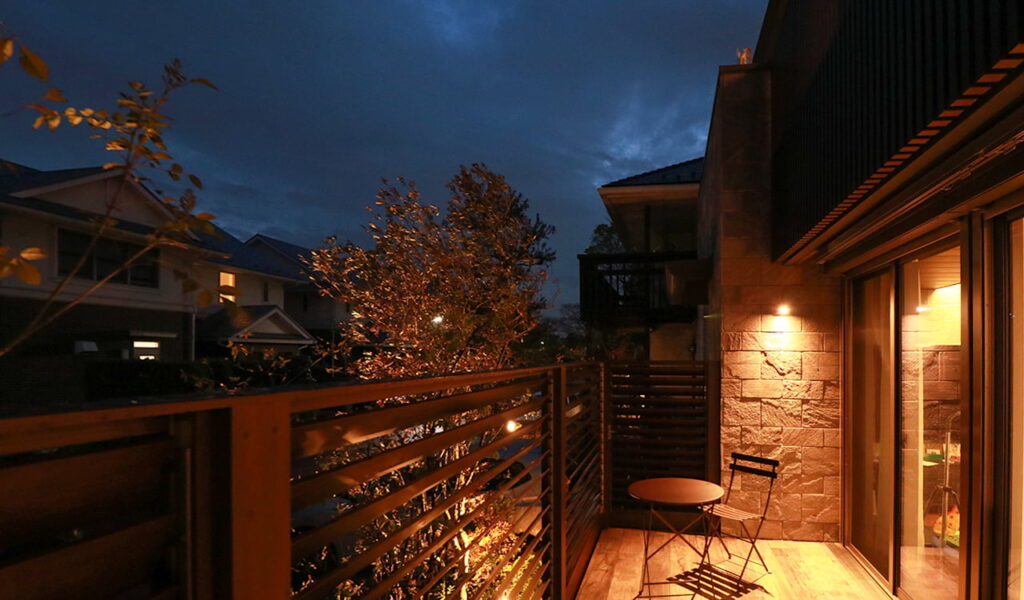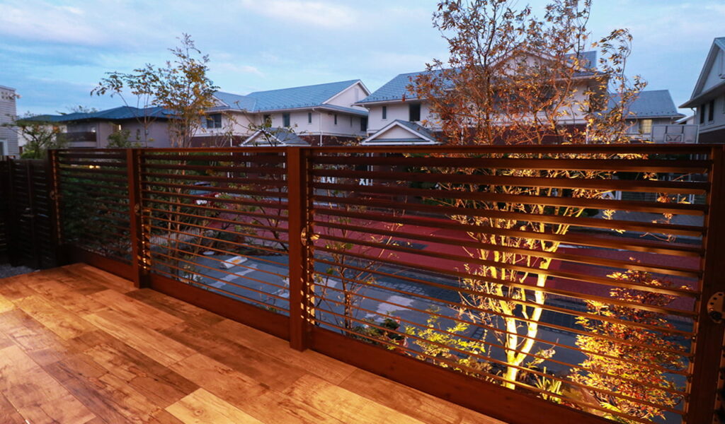 完成したフェンスは、夜になるとリビングの灯りが隙間から漏れ、まるでデザイン照明のような美しさを放ちます。内部はリビングを延長したようなウッド調のタイルデッキスペース。ここに座れば、自然とリラックスした時間が流れます。そして、ルーバーを開けば、眼前に広がる豊かな植栽を眺めることができます。