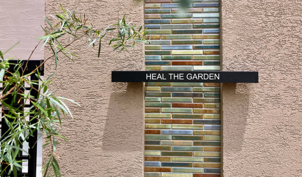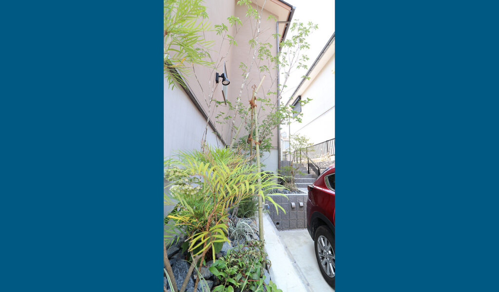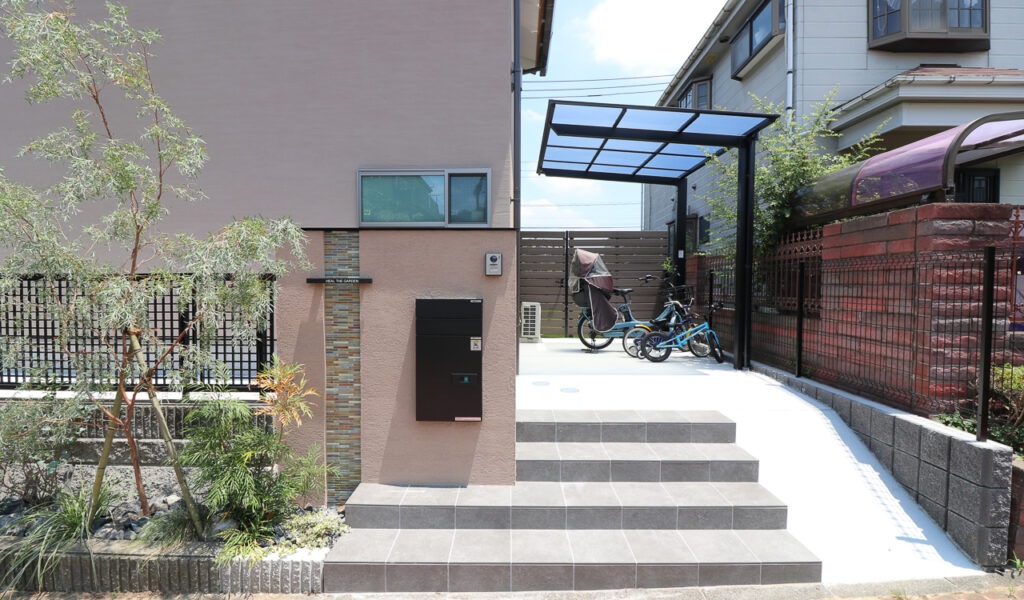 門袖はブラウンカラーのジョリパットで仕上げ、アクセントに色彩的な存在感のあるモザイクタイルを用いて、華やかさをプラス。歩道に面したファサードは四季を感じる植物を織り交ぜた個性豊かな植栽帯で彩りました。清々しさを演出する植栽帯は、駐車場からのアプローチ階段にも設けました。