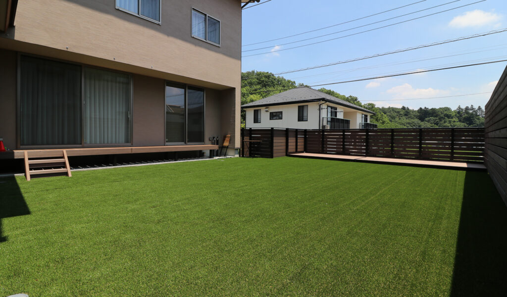 また、お庭は広々とした人工芝と樹脂デッキで、お子様や将来的にワンちゃんが楽しく遊べる空間を創出。前面道路とお庭に高低差があるため、デッキを設けて敷地最大限のスペースを確保しました。どちらもメンテナンスに手間のかからない素材の為、毎日忙しい共働き・子育て世代のお客様にもピッタリです。