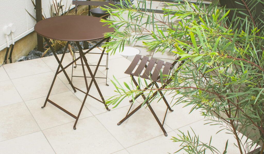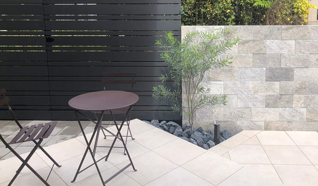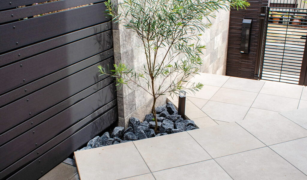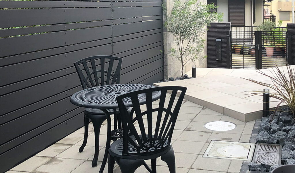 お隣との間のスペースは、以前は植栽が隣家との目隠しになっていましたが、手入れが大変だったため撤去しました。代わりに設置した目隠しフェンスは、念入りに高さを調整しました。以前は通路としてしか使っていませんでしたが、植栽を撤去したことでスペースが広くなり、くつろげるプライベート空間になりました。お客様に選んでいただいた白いタイルを基調とし、その美しさを一層引き立てるダークトーンのフェンスで、プライベートな空間を演出しました。高さのあるフェンスですが、白いタイルが目線誘導し 圧迫感を感じさせないデザインです。
