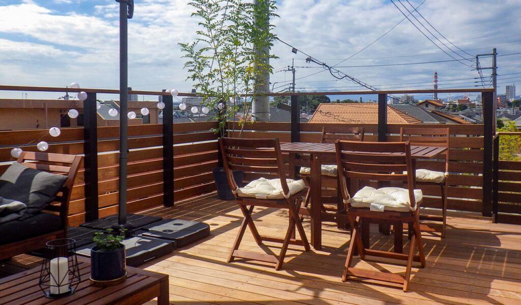 そこで我々は、丈夫で長持ちするイペ材を使ったウッドデッキを提案しました。イペ材は耐久性と安全性を兼ね備え、自然の風合いが楽しめることから選ばれました。スカイデッキは、素材や設計、施工により、安定感や安全性に差が出ます。何よりも安心してお過ごしいただくことが一番だと、細かな配慮をしながら設計・施工を進めました。デッキの一部をソファとパラソルのくつろぎスペースにし、ファブリックや植木鉢を置いて、広々とお過ごしいただいているとのこと、とても嬉しく思っています。