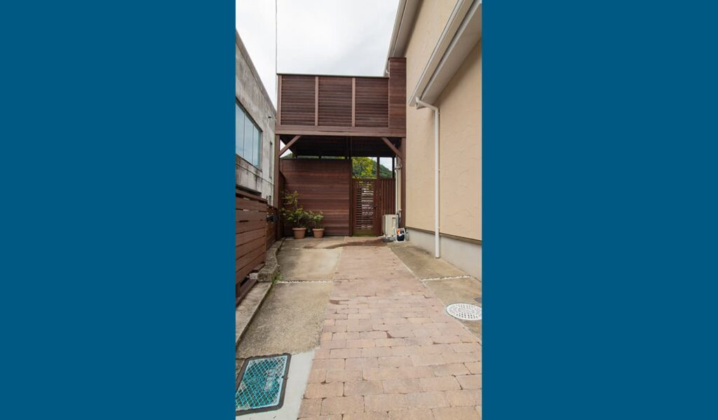 物置の裏側は駐車スペースになっており、外側から見ても違和感のないようデザインしています。造作した扉は、とても使いやすくなったとお喜びいただけました。駐車場の古くなった枕木は撤去し、インターロッキングで舗装。これにより、お客様の毎日の生活がより快適になるよう配慮しました