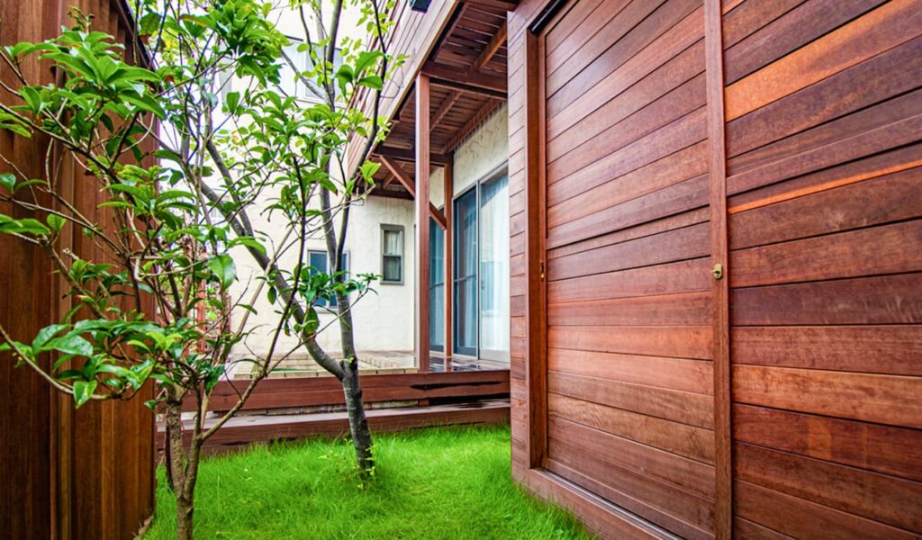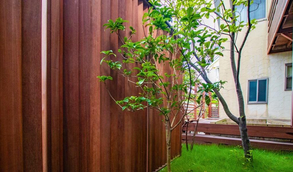 お庭のデッキや物置もウリンで一新。自然素材の風合いと高級感が、緑豊かな葉山の風景と見事に調和しました。お隣との境界には、角度によって見え方の変わるウリン材の縦ルーバーフェンスを設置。見る角度によっては開放的ですが、反対側から見ると、視線を遮る目隠しフェンスになります。お庭のウリンデッキも同じくウリン材で造り変えました。中央部はこれから植栽スペースになる予定です。