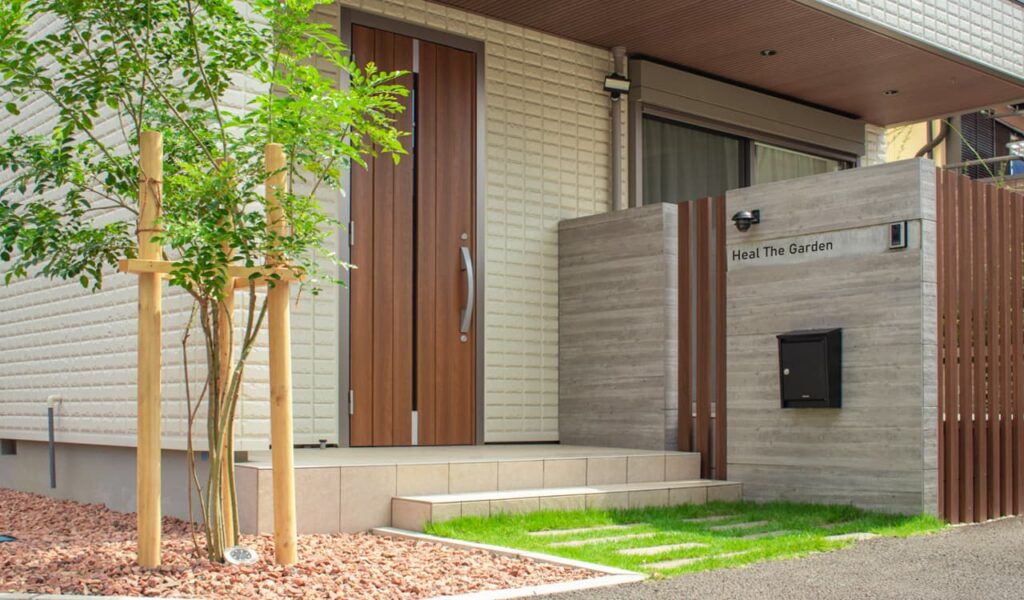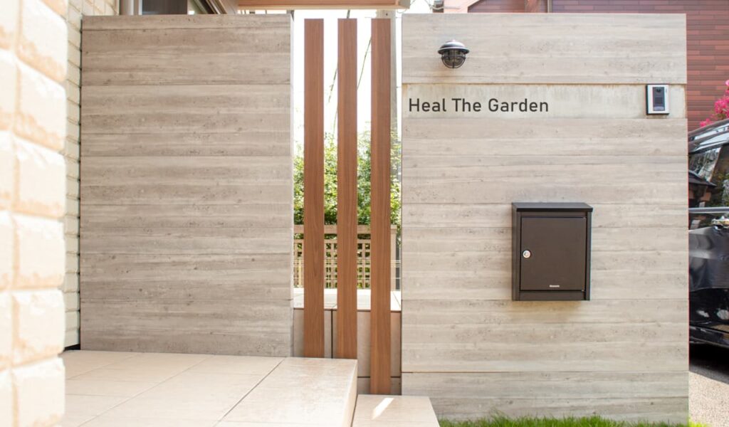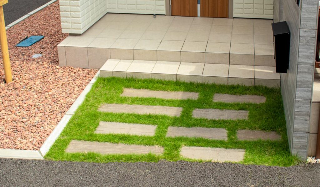 ご新築時に必須であったアプローチは、天然芝と枕木でナチュラルな風合いにデザインしました。日当たり抜群のため、天然芝もよく育ちます。門塀は色味を抑えて落ち着いた雰囲気にし、列柱を使ったスリットを入れて圧迫感を和らげました。