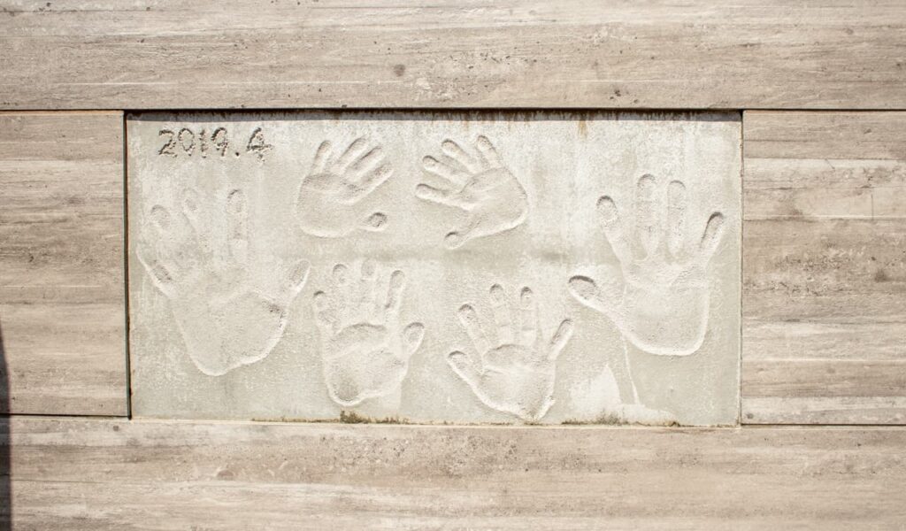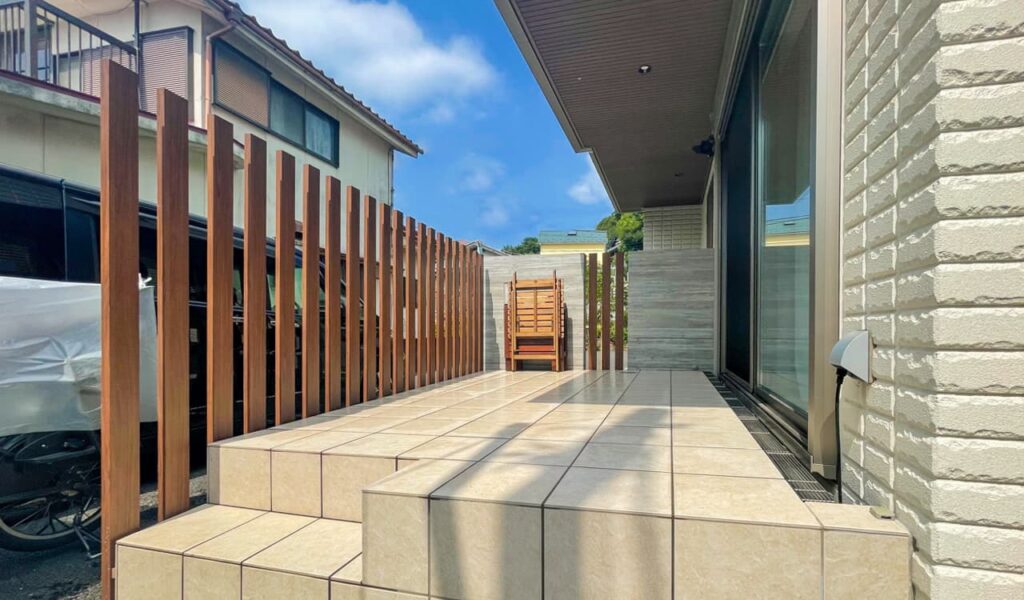 幅広の列柱で目隠しされたタイルデッキは、少しの汚れならすぐに洗い流せるため、気兼ねなくお使いいただけます。デッキ奥の壁には、家族全員の手形のレリーフを飾りました。これにより、お客様家族の絆を象徴するとともに、唯一無二の外構となりました。