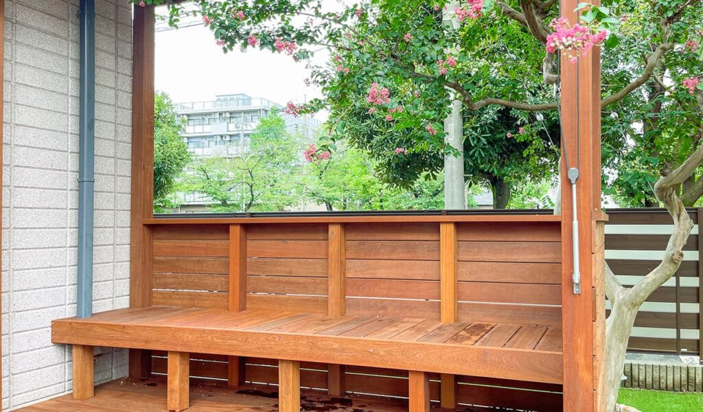 掃き出し窓からフラットに出ることのできるウリンデッキは、日差しを遮るシェードをつけています。秋にはサルスベリが見事な花をつけ、ベンチでお花見を楽しむことができます。