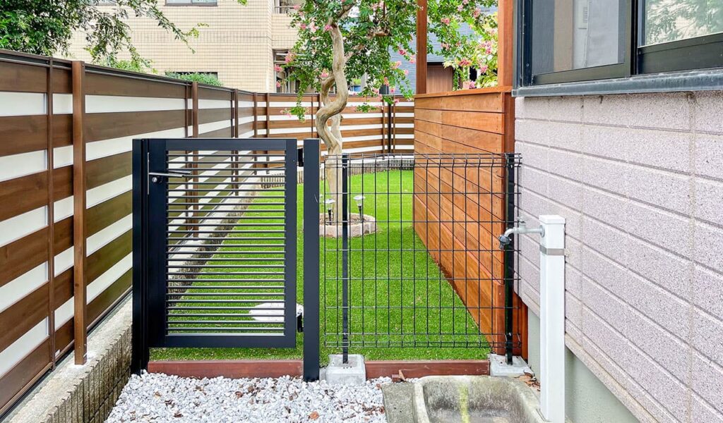 さらに、手入れが大変だった勝手口前スペースの生垣は、木調フェンス門扉へ作り変えました。お庭は野良猫に侵入されないようにメッシュフェンスで囲いました。これにより、お客様は安心してお庭で過ごすことができるようになりました。野良猫対策は他にも、デッキ下をふさいだり、塀の上に忍び返しとして角出しフェンスを設置したり、とにかく侵入経路を断つように様々な工夫を凝らしました。
